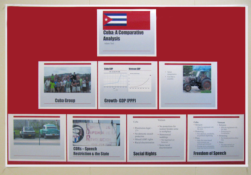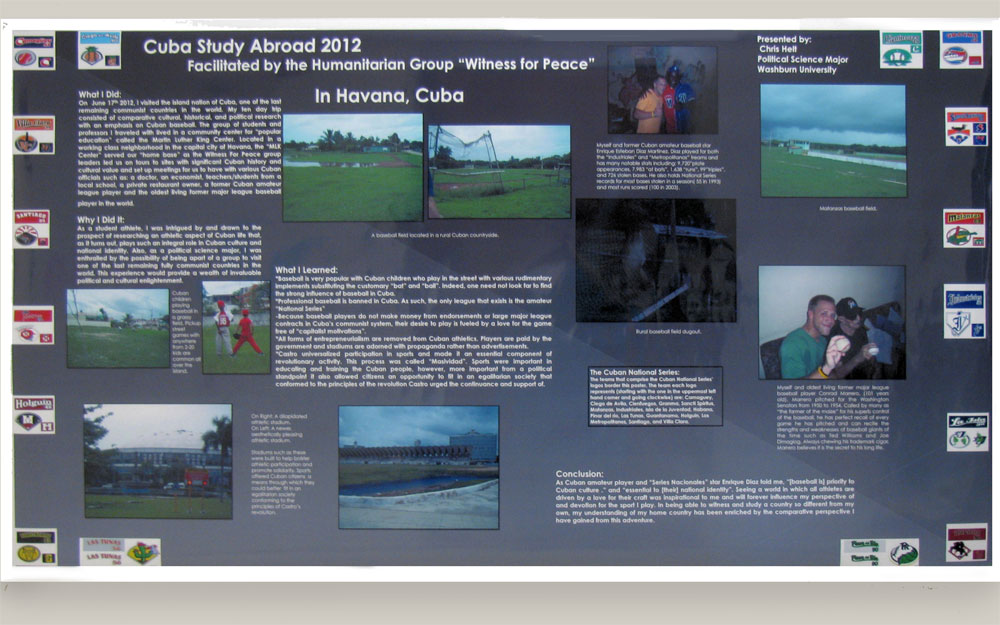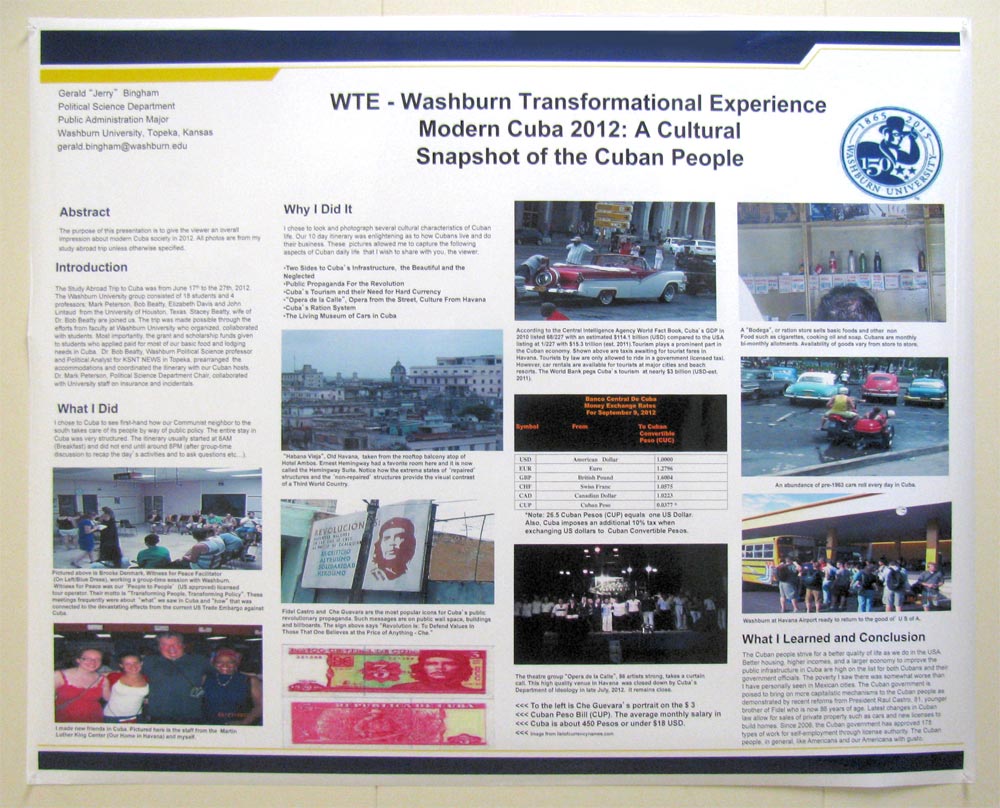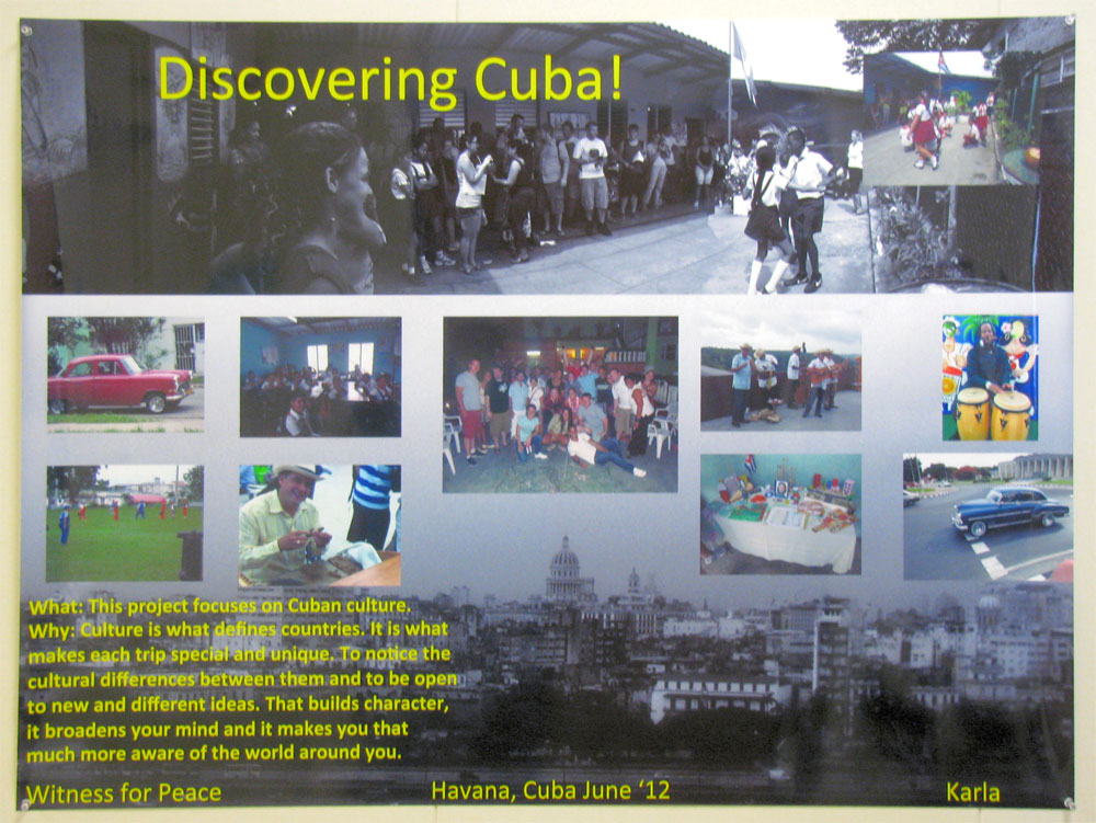 Dr.John Linantud (now at the University of Houston) led19 Washburn students on a 10 day educational exploration of Cuba in June, 2012. The Washburn group was able to go directly from the U.S. to Cuba,without any subterfuge or re-direction through Canada or Mexico owing to a license provided by the U.S. State Department to Witness for Peace. As a people-to-people experience the Cuba trip was a revelation for the Washburn students, few of which had traveled extensively, and none of which had visited Cuba before. While most of the 10 days were spent in Havana, three days were spent out of the city as the group traveled in an ancient yellow school bus to Giron and the Bay of Pigs, then northeast to the city of Varadero, Cuba on the Florida Strait, and then back to Havana.