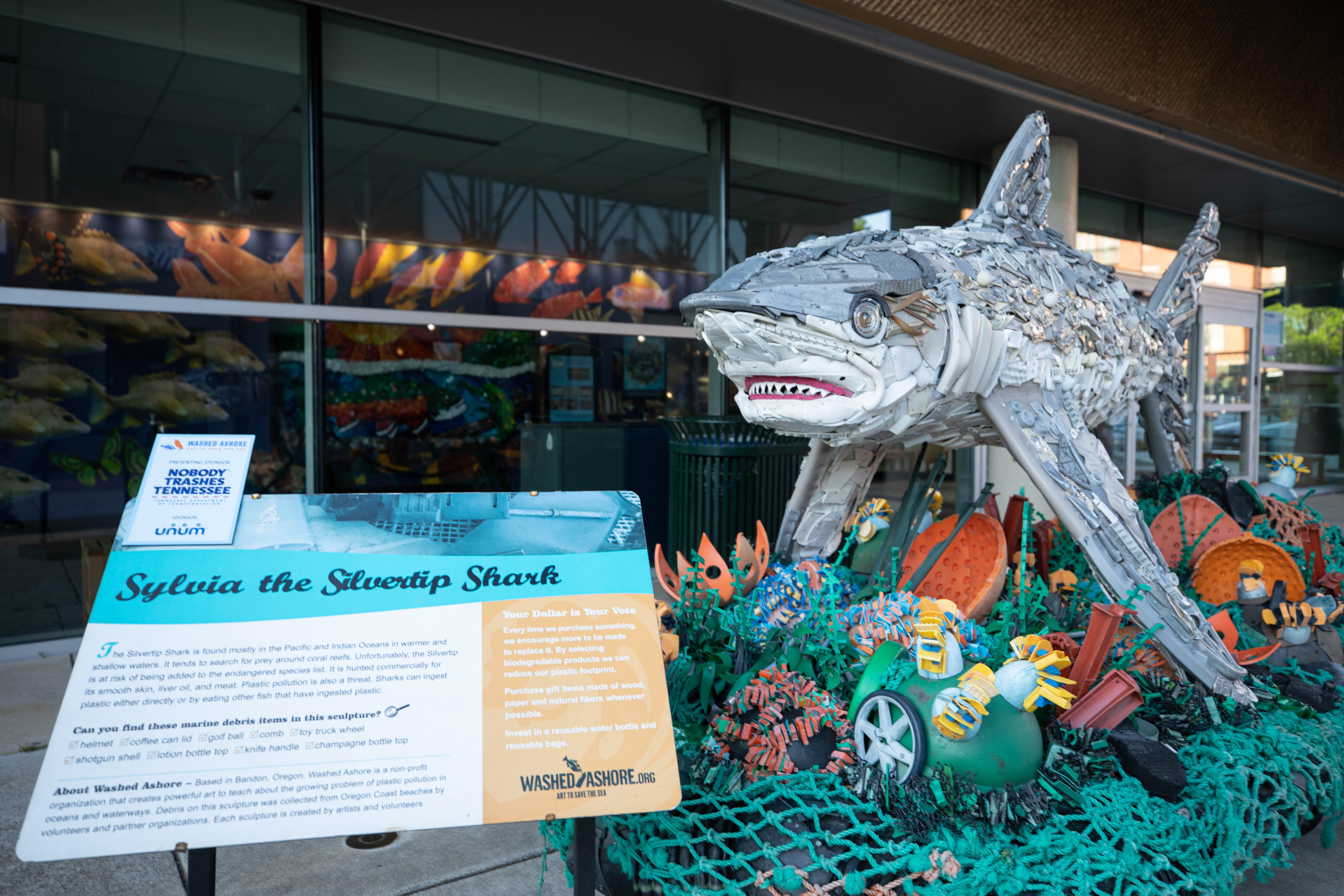 Debris on this sculpture was collected from Pacific Coast beaches by volunteers. Each sculpture is designed and directed by Angela Haseltine Pozzi and then created in collaboration with other lead artists, Washed Ashore staff and hundreds of volunteers in Bandon, Oregon. Trash in the ocean is a worldwide problem.
